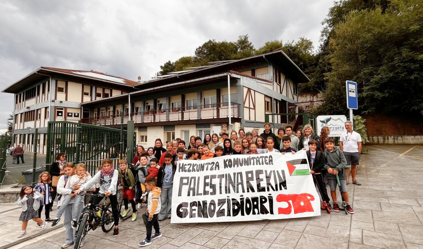 Gaur goizean, Iturzaeta Herri Eskolako komunitateak elkartasuna adierazi nahi izan dio Palestinako herriari. Eskolaren aurrean elkartu gara eta argazkia atera dugu “Hezkuntza komunitatea Palestinarekin! Genozidioa STOP!” dioen pankartarekin.