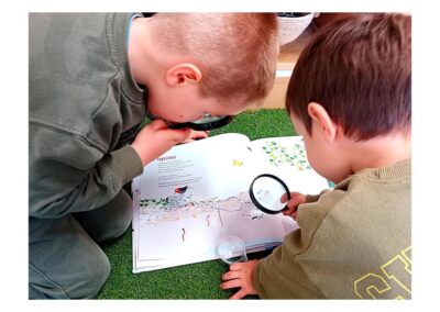 Herriko interesgune eta elkarteetara bisitak egiten ditugu ikasturtean zehar: Eguneko Zentroan daudenekin haiek ezagutzen dituzten abestiak kantatzen ditugu, herriko parkeetan eta San Anton mendian esploratzaile lanetan aritzen gara, Askizura ibilaldia egin eta bertako animaliak ezagutzen ditugu, Balentziaga Museora bisita egiten dugu…